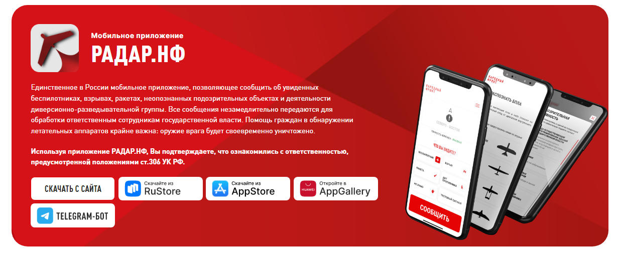Мобильное приложение «Радар.НФ» создано Общероссийским общественным движением «Народный фронт «ЗА РОССИЮ» в 2023 году для помощи людям быстро сообщать о подозрительных объектах – беспилотниках, взрывах, ракетах и других возможных угрозах. Его цель – вовлечь жителей в систему гражданской безопасности и наладить прямую связь между населением и экстренными службами. В среднем в сутки по России поступает до 110 сигналов о возможных воздушных целях, включая регулярные сообщения Инструкция для пользователей: «Как передать сигнал в приложении»: пройти авторизацию по номеру телефона – выбрать тип угрозы – нажать «Сообщить» – направить камеру по направлению движения объекта и сделать фото. Приложение работает даже без интернета – сообщение отправится при восстановлении связи. Как передать сигнал через чат-бот: открыть меню – выбрать «Старт» → «Сообщить о беспилотнике» – пройти авторизацию – отправить фото Защитите себя и своих близких! Установите «Радар.НФ»: RuStore AppGallery. Пользователи iOS могут сообщить об увиденном через чат-бот проекта «Кибердружина». |