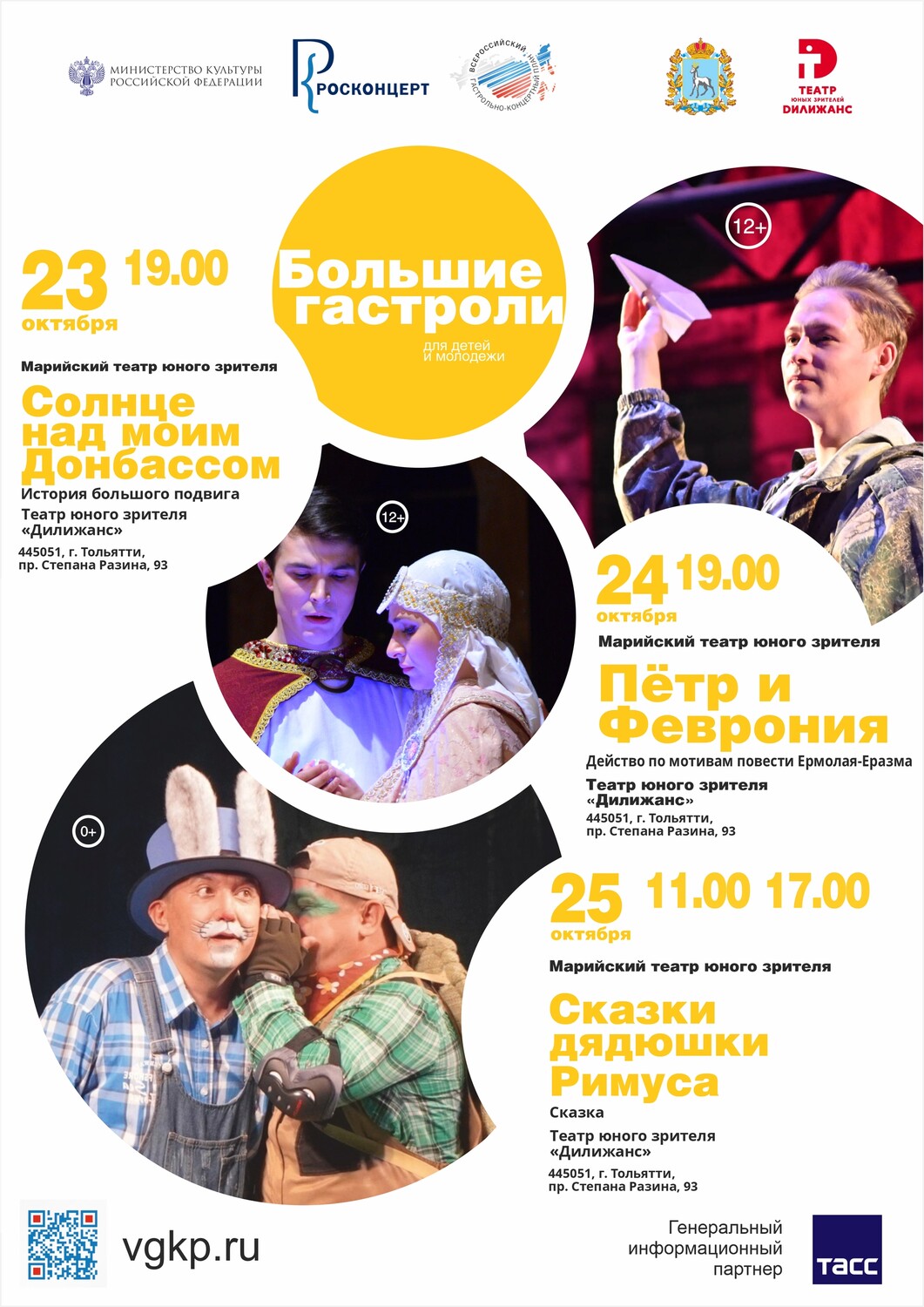 С 23 по 25 октября состоятся «Большие гастроли» Марийского театра юного зрителя в г. Тольятти, организованные ФГБУК РОСКОНЦЕРТ согласно Всероссийскому гастрольно-концертному плану Министерства культуры Российской Федерации.